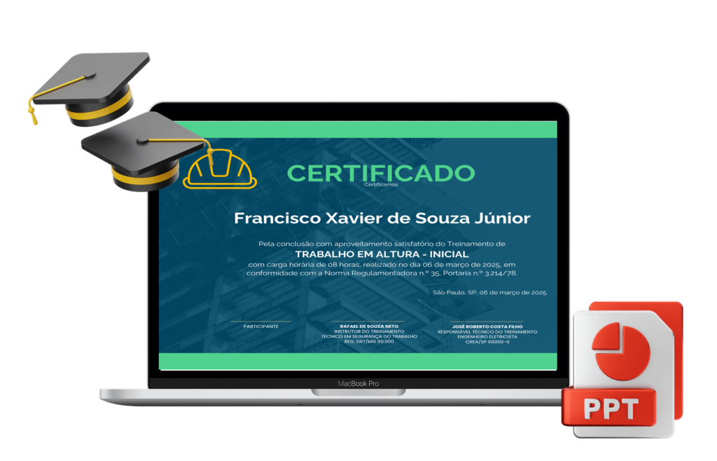 Certificados prontos que atendem aos requisitos da NR1 e podem ser usados em qualquer tipo de treinamento com total segurança jurídica.