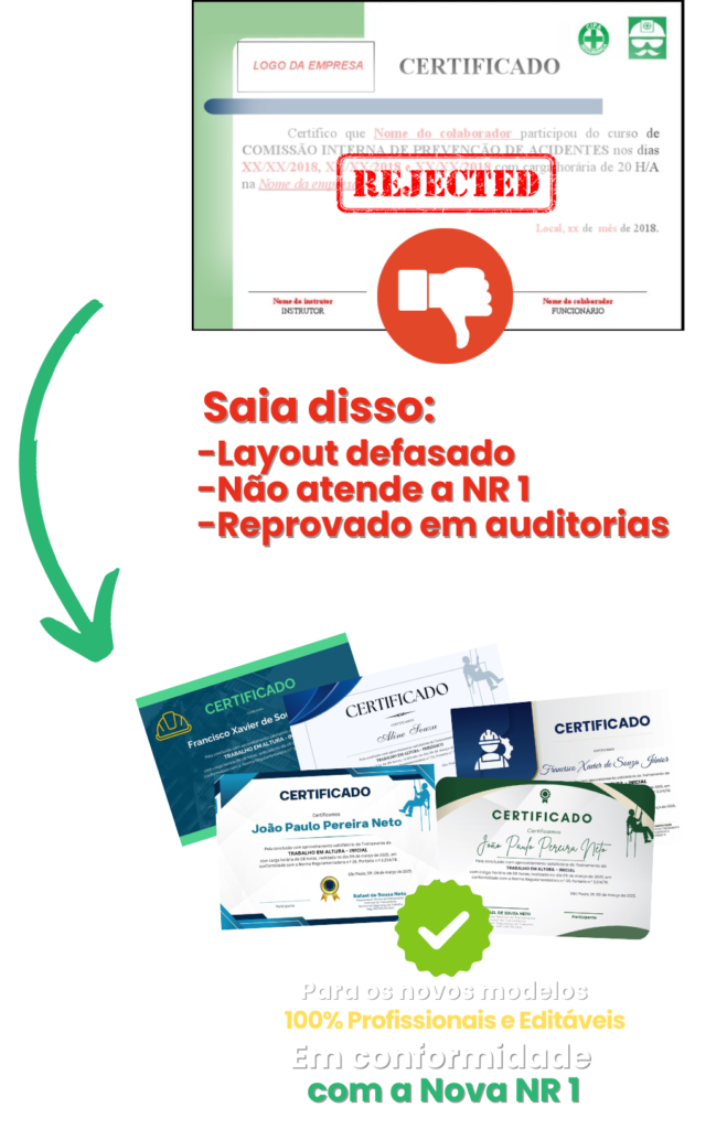 Com os Modelos de Certificados NR1 Prontos, você vai economizar horas de trabalho e garantir a qualidade e conformidade dos seus documentos, sem se preocupar com a burocracia.